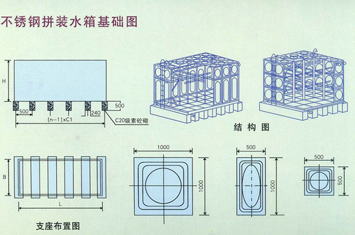 2、玻璃鋼水箱按規范SS177設計,材質為SUS304,耐腐蝕性強、抗震性能好、便于運輸、無需大型吊裝設備.不同容積均可現場組裝。
